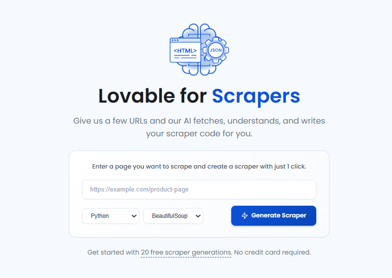 Simply give it a few example URLs (product pages, listings, articles, etc.), and it generates working scraping code in minutes.